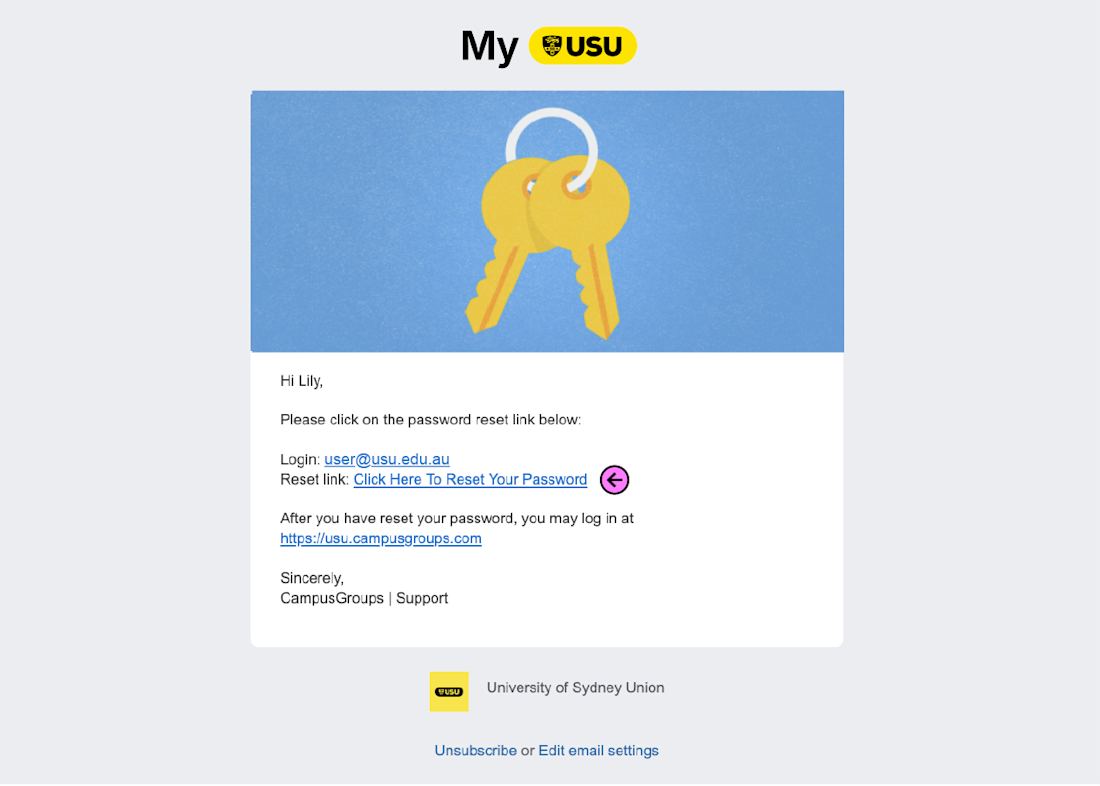 Step 3: Check your inbox for an email from 'MyUSU' (sit tight, this could take a few minutes to reach you). Reset your password by clicking ‘Click Here to Reset Your Password’.
